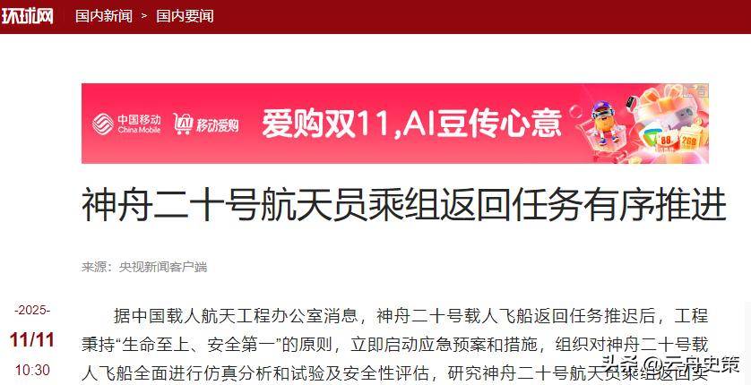 最新消息显示,神舟二十号航天员的返回任务正在有序推进,同时着陆场也开始了综合演练,为神舟二十号的安全返回做准备。