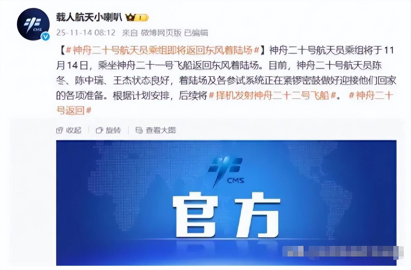 11月14日,中国载人航天工程办公室正式发布了最新消息,央视网等平台第一时间转发。消息明确表示,神舟二十号的航天员将乘坐神舟二十一号返回地球。神舟二十一号本就是本次任务的备份飞船,10月31日发射后,11月1日便与空间站成功对接。它和神舟二十号同时在轨,形成了双船保障的布局,就是为了应对突发情况。