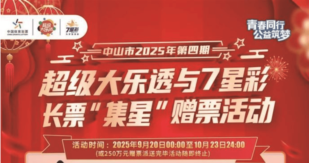 广东中山体彩2025年第四期超级大乐透与7星彩长票“集星”赠票活动于9月20日开启,本期共将送出250万元赠票。活动时间为9月20日至10月23日。活动期间,购彩者购买超级大乐透(含追加)或7星彩一票10注彩票(一张单期票面打印10注单式号码的彩票),或购买超级大乐透套餐票,即可获得一次活动机会。一票10注的预售票(按购买时间)、多倍票、多期票首期可参与活动且单票只有一次参与机会。多期票的补打票不参与活动。
