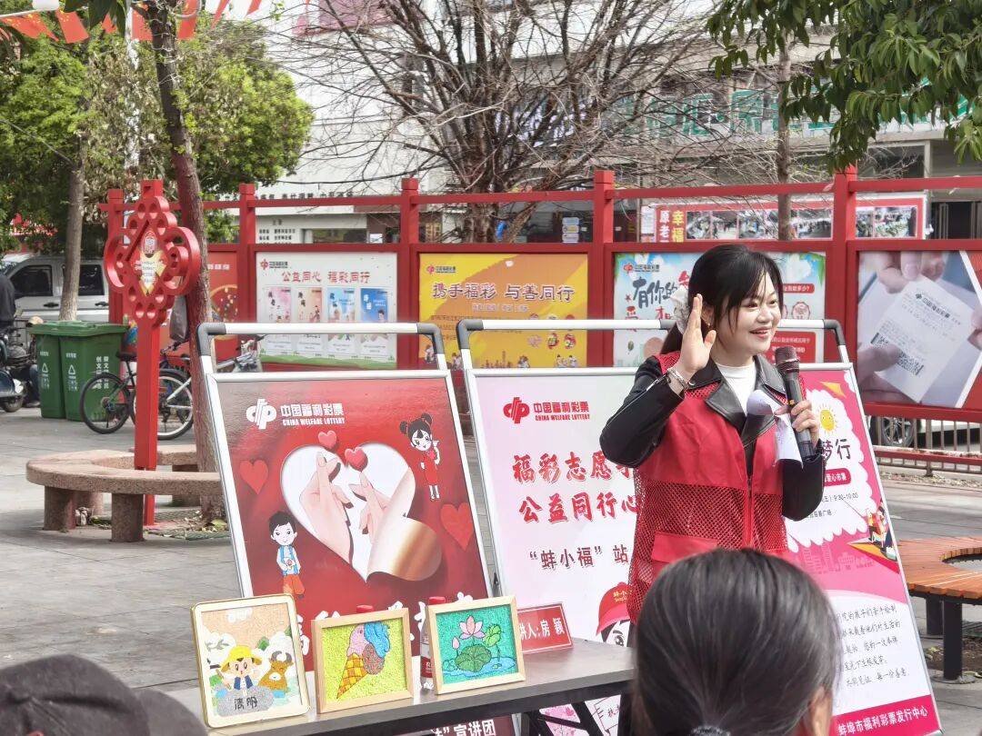 ▲安徽省蚌埠市福彩中心组建“福哥·彩妹”宣讲团,为市民讲解公益金使用成效。