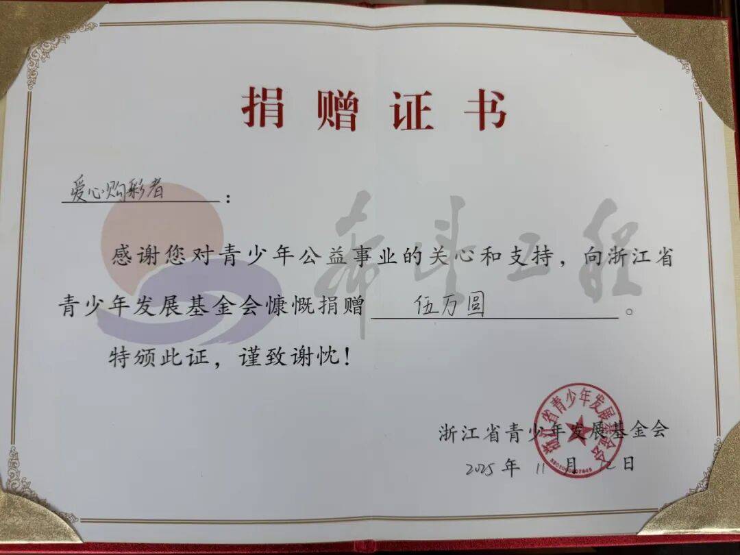 在办理兑奖手续过程中,林女士主动提出向浙江省青少年发展基金会捐赠50000元,希望为青少年的成长和发展贡献自己的一份力量。这一善举恰恰体现了中国体育彩票“来之于民、用之于民”的发行宗旨,也彰显了购彩者的爱心和社会责任感。