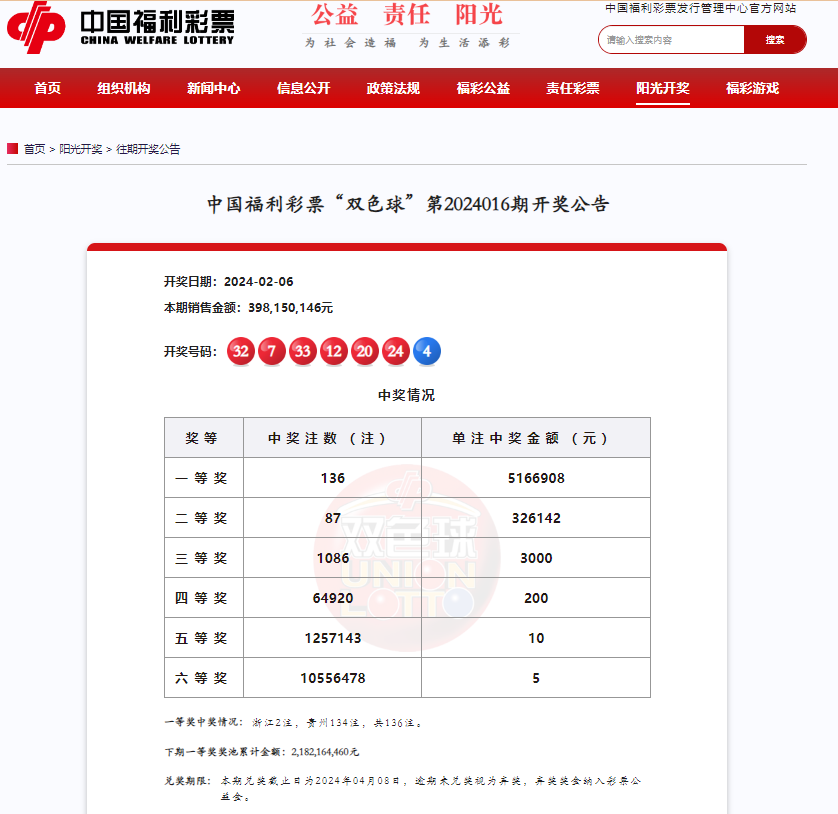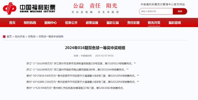 2月6日晚,福彩双色球第2024016期开奖。2月7日上午,中国福利彩票发行管理中心官方网站发布消息,本期一等奖开出136注,其中贵州134注,单注中奖金额516万余元。