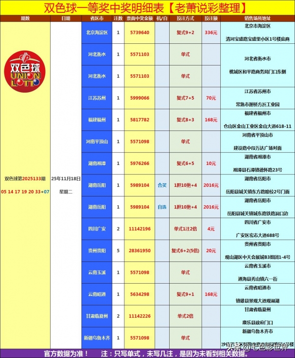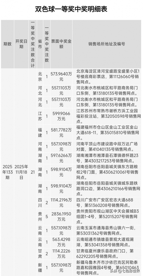 好,以上就是双色球第25133期一等奖中奖明细介绍,感谢您的阅读,我们下期再会!最后依旧是温馨提示:购彩有风险,请量力而行!