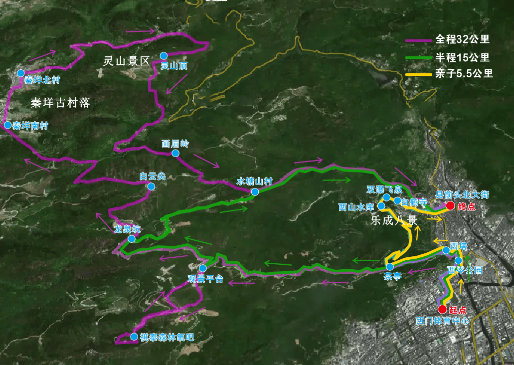 大众组路线:西门体育中心→西岑公园→西塔→茶亭→观景平台→龙泉坑→水塘山村→县前头北大街