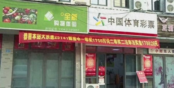 那张幸运票出自浙江嘉善西塘的一家网点,靠近老街巷口,店门口蓝白色体彩灯箱常亮,晚饭后人会慢慢多起来