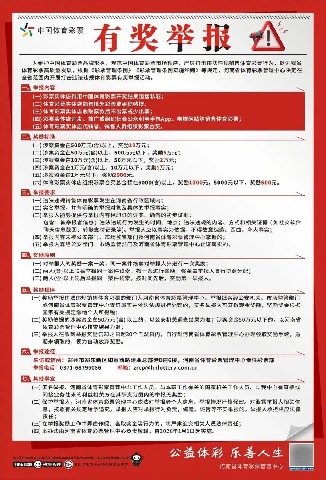 为维护中国体育彩票品牌形象,规范中国体育彩票市场秩序,严厉打击违法违规销售体育彩票行为,促进体育彩票高质量发展,近日,河南体彩在全省范围内开展打击违法违规体育彩票有奖举报活动,相应有奖举报办法自2026年1月1日起实施。