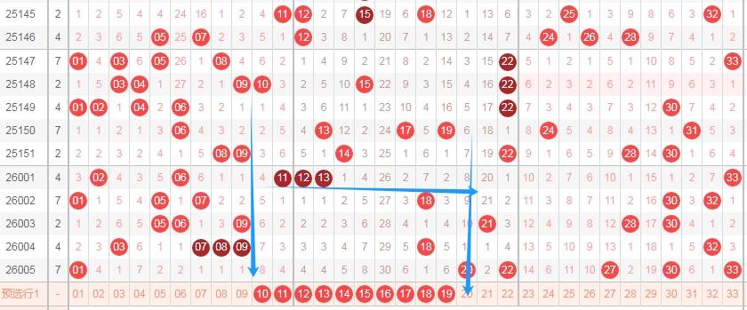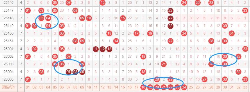 上图是福彩双色球红球号码走势分布图,我在上面画出来的蓝色圈圈可以发现,最近号码都是集中在一起的,看最左边的蓝色圈圈就知道,上期出现了20 22那么本期关注这两个数字附近的号码18 19 20 21 22 23 24出2个或者3个吧。