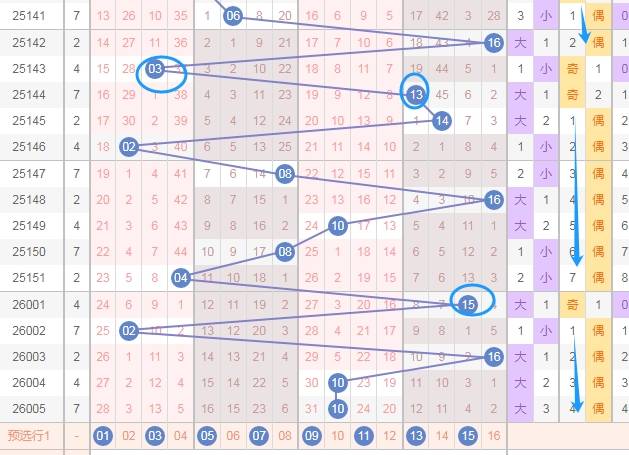 这是福彩双色球蓝球开奖号码走势图,我在上面标注出来的数字都是奇数,看最右边奇数偶数,就知道从最上面到最下面奇数只出现了3期其余的都是偶数,看上面走势图我标注出来的蓝色圈圈表示的是奇数,最近开出的奇数少,那么本期个人观点应该留意一下奇数蓝球号码数字01 03 05 07 09 11 13 15。