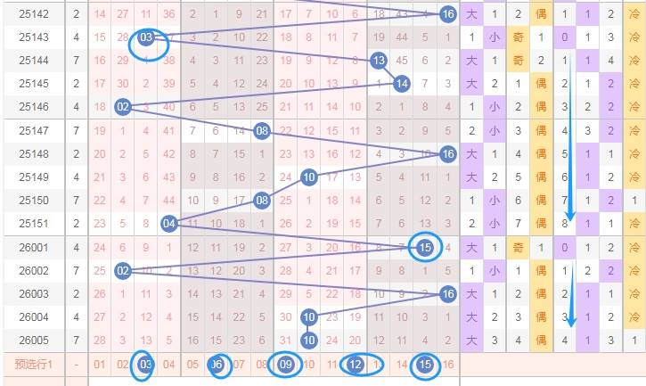 这是福彩双色球蓝球开奖号码走势图,我在上面标注出来的数字都是0路球数字03 06 09 12 15,看最右边的蓝色箭头会发现,最近开出的0路球数字少,所以本期还要留意一下0路球数字。