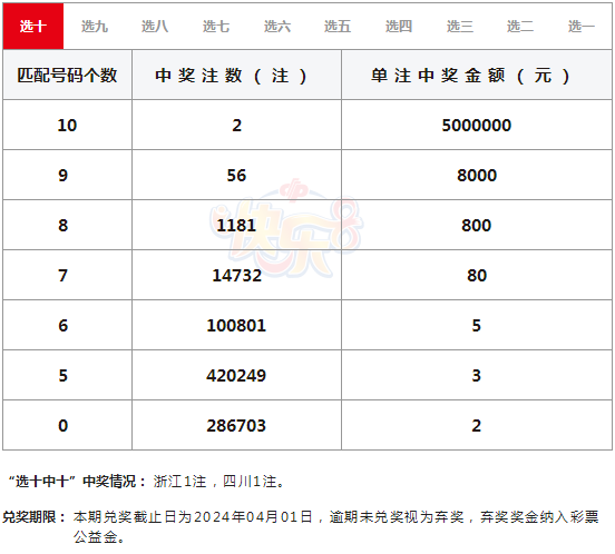 快乐8第2024030期,全国中出2注选十中十大奖,单注奖金500万元,大奖出自浙江、四川。