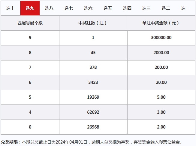 继上一期(第2024029期)济宁彩友凭借机选单式票揽获1注选九中九,本期山东彩友再次喜中1注选九中九30万元大奖。