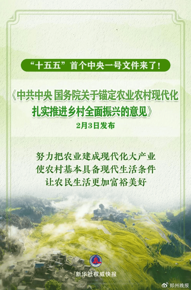“十五五”首个中央一号文件来了!2月3日,2026年中央一号文件《中央 国务院关于锚定农业农村现代化 扎实推进乡村全面振兴的意见》正式发布。