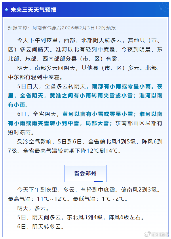 河南大回暖进行中,周三多地最高气温将突破15℃。然而,随着一股实力强劲的冷空气抵达河南,预计6日白天,全省大部的最高气温将跌至不足5℃,信阳、南阳一带将在一天内骤降15℃!最低气温也将同步下探,7日早晨将迎来近期的气温低点,西部、北部等地最低气温将重返-5℃以下,寒意深重。除了气温跳水外,雨雪+大风的经典组合也将一同赶来↓