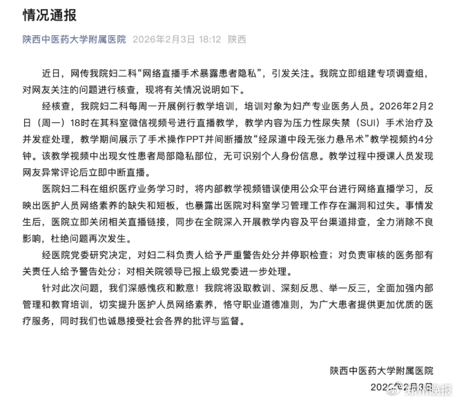 陕西某医院直播“妇科手术”,被指暴露患者隐私部位,高峰期在线万多人,网友集体举报。2月3日,陕西中医药大学附属医院通报“直播暴露患者隐私部位”:深感愧疚和歉意,相关负责人被严重警告并停职。